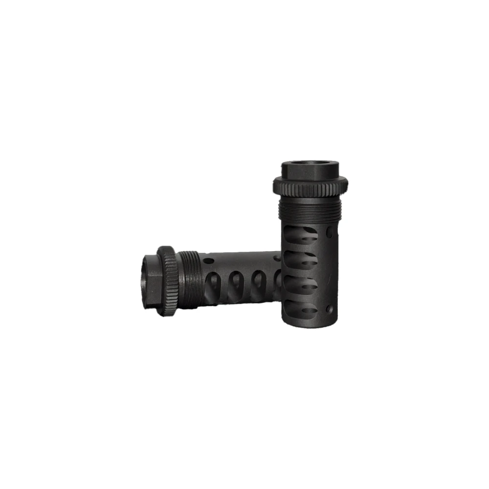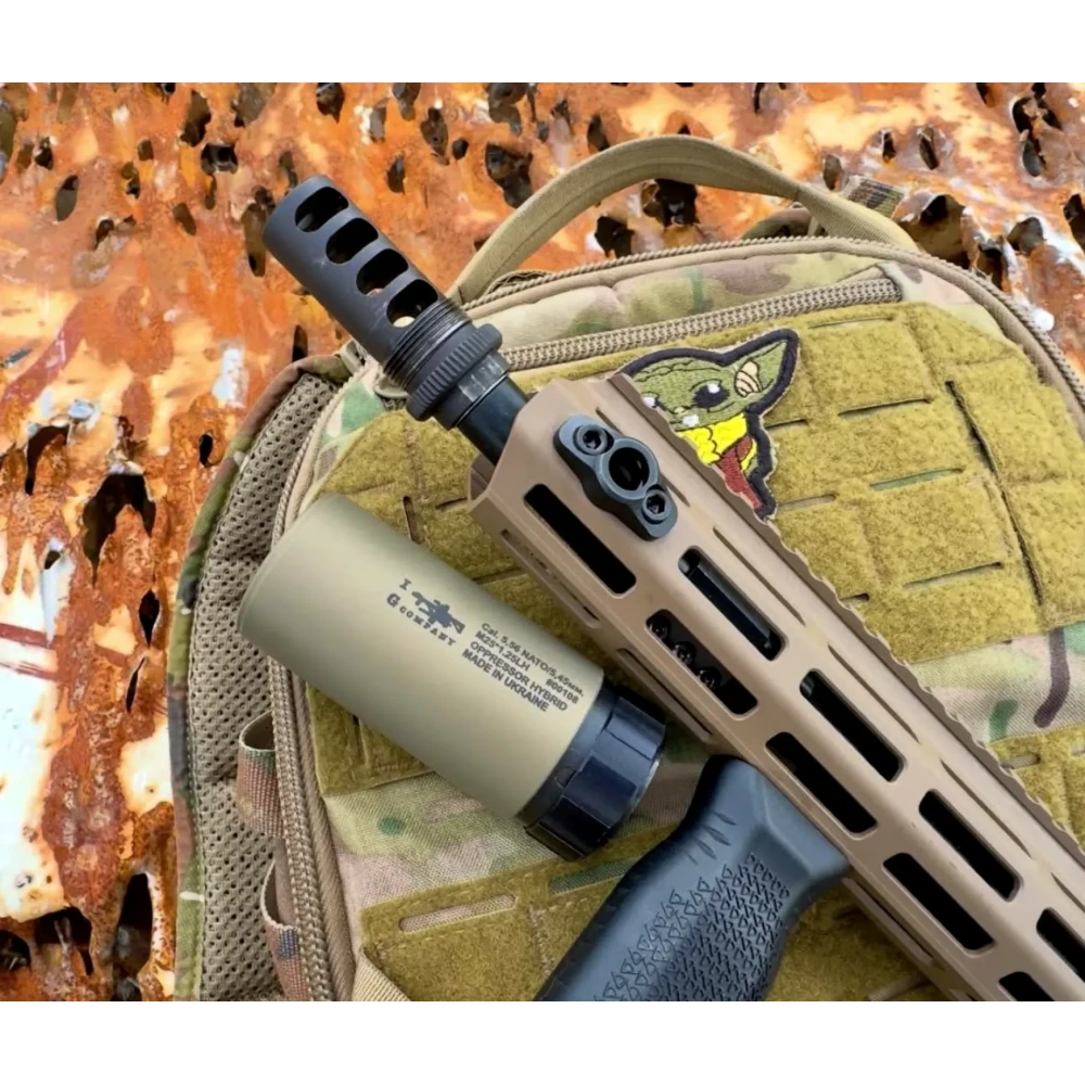 Корпус виготовлений із міцної легованої сталі, стійкої до зносу та високих температур. Дульний пристрій розрахований на роботу в екстремальних умовах і підходить для різноманітних бойових та тактичних сценаріїв. Наявність зовнішньої різьби дозволяє інтегрувати ПБС.