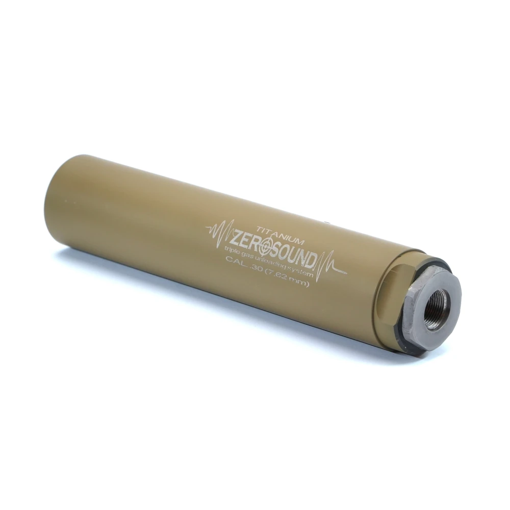 Zerosound TITAN .30 cal — цільнофрезерований саундмодератор українського виробництва від XGUN, повністю виготовлений з титану та алюмінію з міцним покриттям Cerakote. Це компактний і ультралегкий прилад для ефективного зниження рівня звуку пострілу, приховування спалаху та відведення порохових газів, ідеальний для тактичного, мисливського та спортивного використання на гвинтівках .30 калібру.