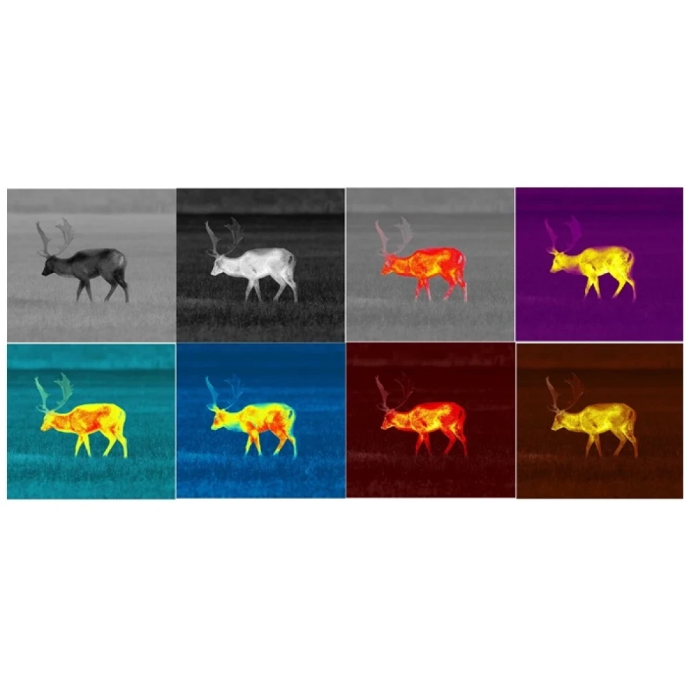 Функції: 8 колірних палітр (White Hot, Black Hot, Red Hot, Rainbow, Ultramarine, Red Monochrome, Sepia, Violet), 4 режими спостереження (Forest, Rocks, Identification, User), покращення зображення Image Detail Boost для підвищення контрасту та деталізації.