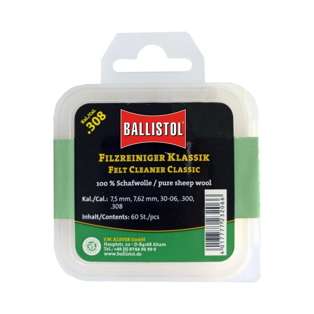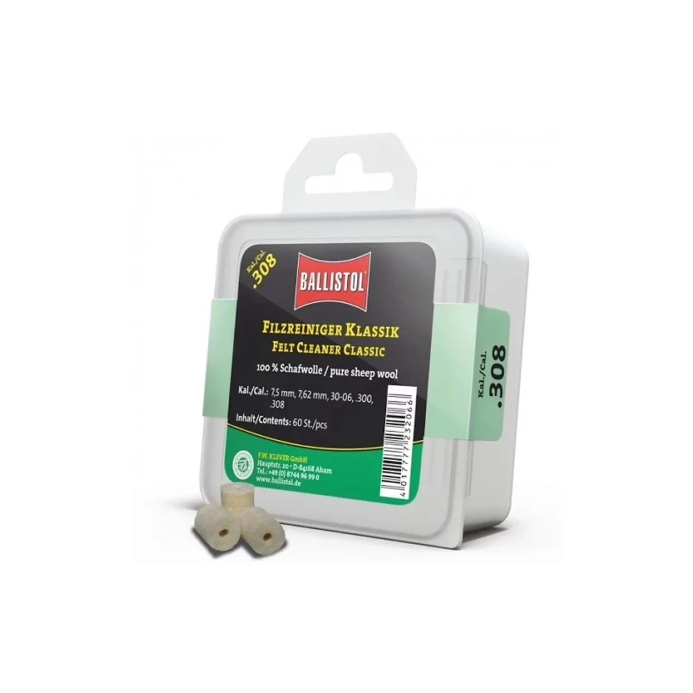 Повстяні патчі Klever Ballistol Classic .308 призначені для ефективного очищення стволів нарізної вогнепальної зброї. Вони виготовлені зі 100% натуральної овечої вовни, що забезпечує відмінні абсорбуючі та чистячі властивості під час використання з мастилами та засобами для чищення зброї.