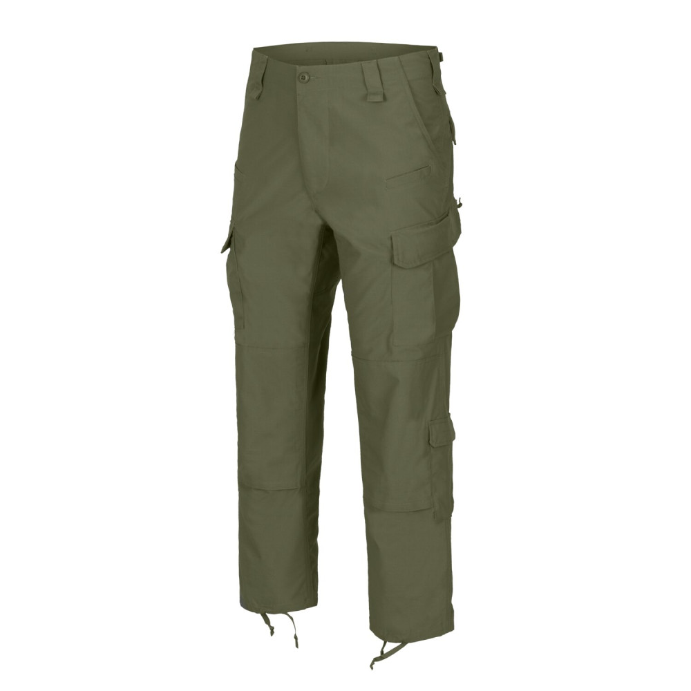 Helikon-Tex® CPU® Pants - штани CPU (Combat Patrol Uniform®) були розроблені у відповідності з останніми стандартами уніформи польських збройних сил від 2010 року. Виготовлені з матеріалу PolyCotton Ripstop (40% поліестер, 60% бавовна): полікотону щільністю 215 г/м² зі спеціальним зміцнюючим плетінням (Ripstop). Відрізняються практичністю і функціональністю. Особливості: Пояс регулюється пасками з металевими затискачами Поясні петлі для карабінів або D-кілець Фронтальна застібка - гульфик на гудзиках Дві бічні прорізні кишені Дві малі прорізні кишені Дві похилі кишені Cargo з клапанами регулюються шоккордом з фіксатором та застібаються на гудзики і липучку Дві задні кишені з клапанами Дві кишені внизу штанин з клапанами Посилюючі накладки на колінах і сідницях Кишені на колінах для демпферних вставок (наколінників) Низ штанин регулюється стяжними шнурками